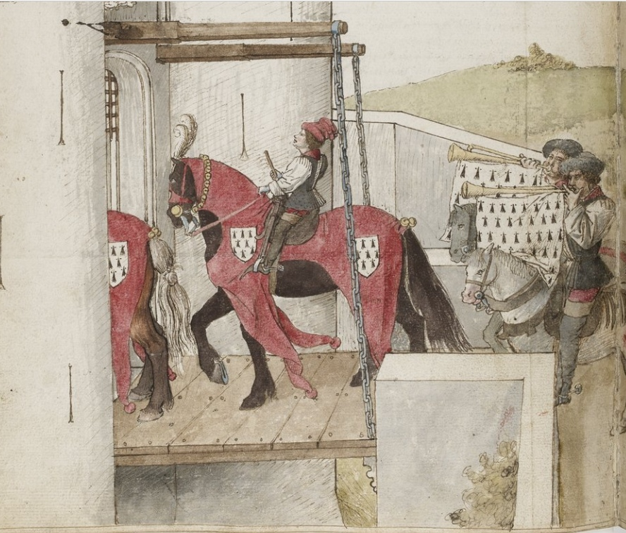 И вот под звонкий звук труб по турнирному полю проезжает пышная процессия. Оруженосцы или герольды несут в руках штандарты на древках. Рыцари держат в руках щиты с нарисованными гербами. Коней покрывали попоной с изображением геральдических эмблем. Основной геральдический символ нарисован и на шорах лошади. Самого рыцаря закованного в латы было не видно. Но на нем могла быть туника цвета гербового поля или накидка с вышивкой из геральдических элементов. Гербы изображались и на седлах, оружии, уздечке, и на любом предмете имущества рыцаря. Рядом ехали дамы, и их накидки вышивались также, но с уже их родовыми гербами. Некоторые женщины одевали золотые или серебряные пояса и вешали на них декоративные мечи. Вокруг турнирного поля выставляли штандарты рыцарей и княжества, или города, в котором проводился турнир.