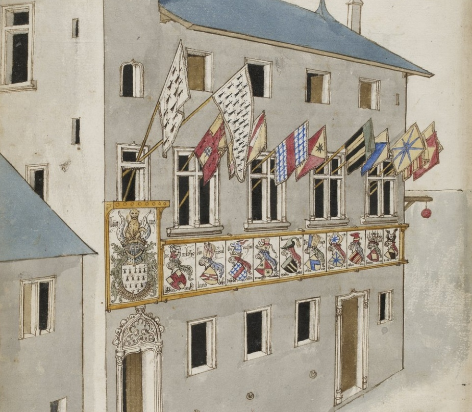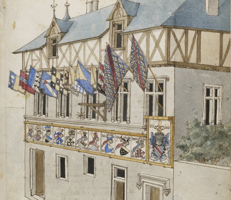 И вот вы идете перед гостиницей где остановились прибывшие на турнир рыцари. Прямо на фасаде висят шелковые флаги с их гербами. Причем в строгом порядке, выше более титулованные, наиболее знатные и крупные феодалы, ниже поскромнее с титулом баронета и еще ниже простые рыцари. Или в один ряд, в зависимости от количества. Флаги могли вывешивать на домах и монастырях, если рыцарь останавливался там. В турнирной книге Рене Анжуйского 15 века на одной из иллюстраций показан порядок флагов. Такая выставка гербов была для зрителей программой праздника. Так они представляли кто выступит и на какое зрелище рассчитывать. Поэтому под гербами собирались толпы что бы получить максимум сведений о рыцарях про которых раньше не было известно.